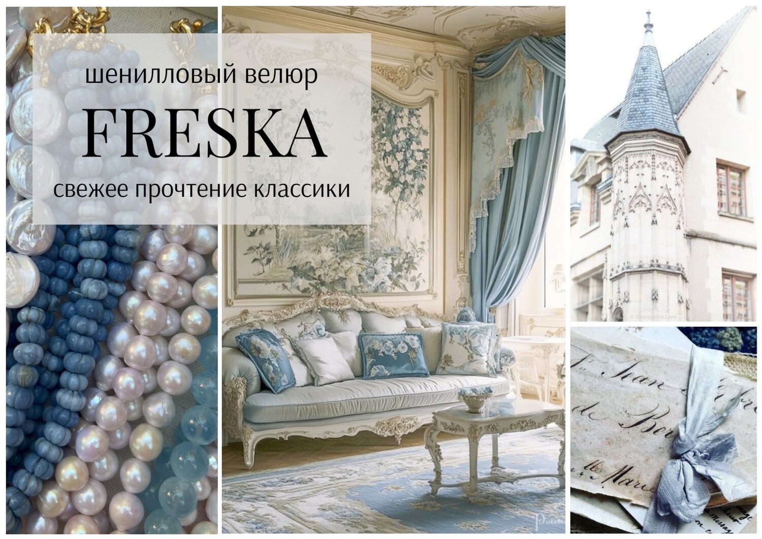 Коллекция шениллового велюра Freska радует той самой палитрой в понятных классических оттенках королевского синего, киноварного красного, шафранового жёлтого, селестианского голубого и, конечно, в ней на особом месте оттенки серебра, бронзы, стали и мрамора. При этом фактура материала имеет неоднородную структуру, она матовая, бархатистая, но при этом рельефная. Часть ворсинок выполнена из глянцевых волокон, что в сочетании сrush-эффектом создает на поверхности сложную игру света и простая матовая фактура дополняется мягкими бликами.